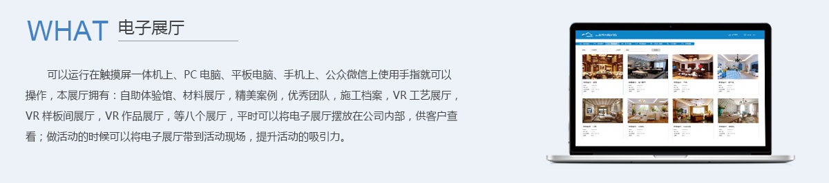 现在装修公司或多或少的都有自己的主材,但是展厅的面积始终是有限的,不可能将每个型号的产品全部都展示出来;而通过电子展厅就可以实现,客户看起来也非常方便;使用比较有优势的辅材工客户体验